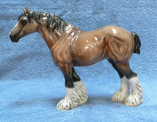 | This is the Cheval Drafter released by 1997 and is a limited edition of 2500. This same horse came with a molded on halter very early but that was discontinued. There was also another drafter mold that was slightly different named the "Belgian". It was discontinued before 2001. This current mold is available in many colors and finishes. |