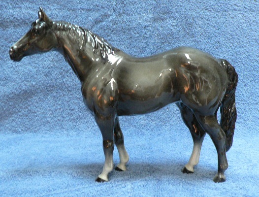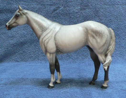 | This is also a Cheval Limited Edition horse. It is called the "Quarter Horse" and was released around 2000; it is a limited edition of 2500. This run is offered in a wide range of colors and in matte, satin and glossy finishes. This one is a matte dappled grey. There is another mold that is very similar called the "Thoroughbred", the difference being a slightly thinner body and a longer tail not on the hock. |