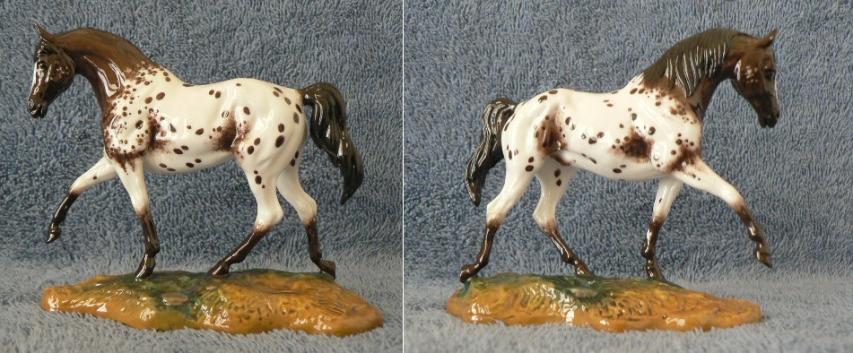 | This is the"Partbred Gelding" mini mold by Clermont Malvern Fine China. This mold was one that was purchased by Horsing Around. Several colors were produced in small OF runs by Alchemy Ceramics. This Appaloosa color and the grulla pinto below were special runs for HA subscibers only. |
