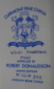 | This is the Welsh Pony Stallion mold sculpted by Robert Donaldson and produced by Clermont Malvern Fine China. The limited edition run was supposed to be 500 but the run was never completed. The factory was only in business about 5 years (approximately 1975-80) and it is likely that few were made. |