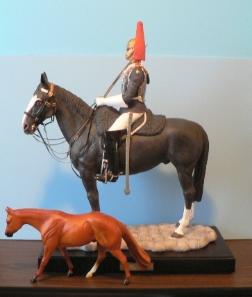 | I stumbled across this enormous figurine (23" tall and 18" long!) at an online auction. I didn't realize what a find it was until I had done some research. The artist Richard Sefton is the sculptor of horse figures for Connoisseur of Malvern. In an odd twist of fate, Richard Sefton was chosen to immortalize the horse named Sefton, who was named after Lord Sefton an officer in the Queen's Royal Household Cavalry. For that reason this sculpture is often called "Sefton by Sefton". There were only 25 made and this is #9.The saber and chain work on this figurine is all solid sterling silver. Sefton was not a beautiful horse and neither is his sculpture. But it is an amazing likeness to the real horse and his rider, down to his registration number on his hoof! |