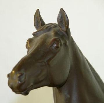 | This was a potrait sculpture. Birkhahn was a German racehorse sired by Alchimist (above). He won the German Derby in 1948, one of two sons of Alchimist to do so. Out of 22 starts he had 16 wins. His base is marked with his sire and dam: "Alchimist x Blaue Blume (Braemouse)" |