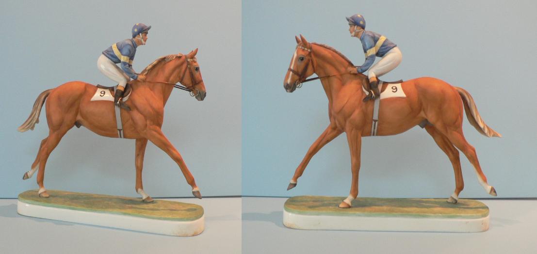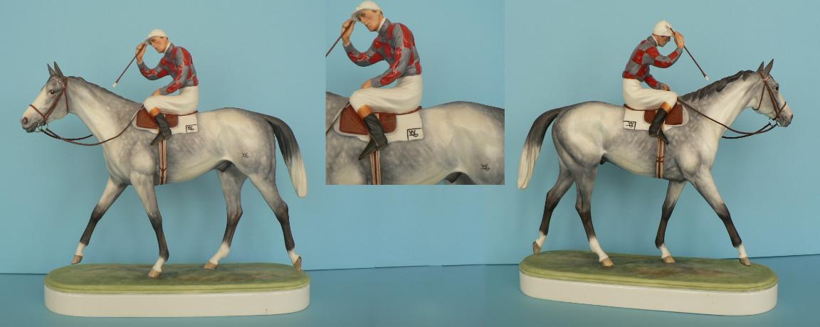 | RW3671 "The Winner" sculpted by Doris Lindner Ltd Ed of 500 released in 1959. Royal Worcester allowed racehorse owners to request their silks on the jockey and their stable logo on the saddle cloth on the standard gray and bay Winners. This is one of those examples. |